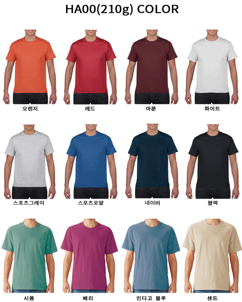 12개 색상 , 해머 210g/m²(20수) Asia Size 면 반팔 스타일로 소재가 부드럽고 축율방지가공으로 품질이 우수한 단체티로 인쇄에 최적화된 아이템.