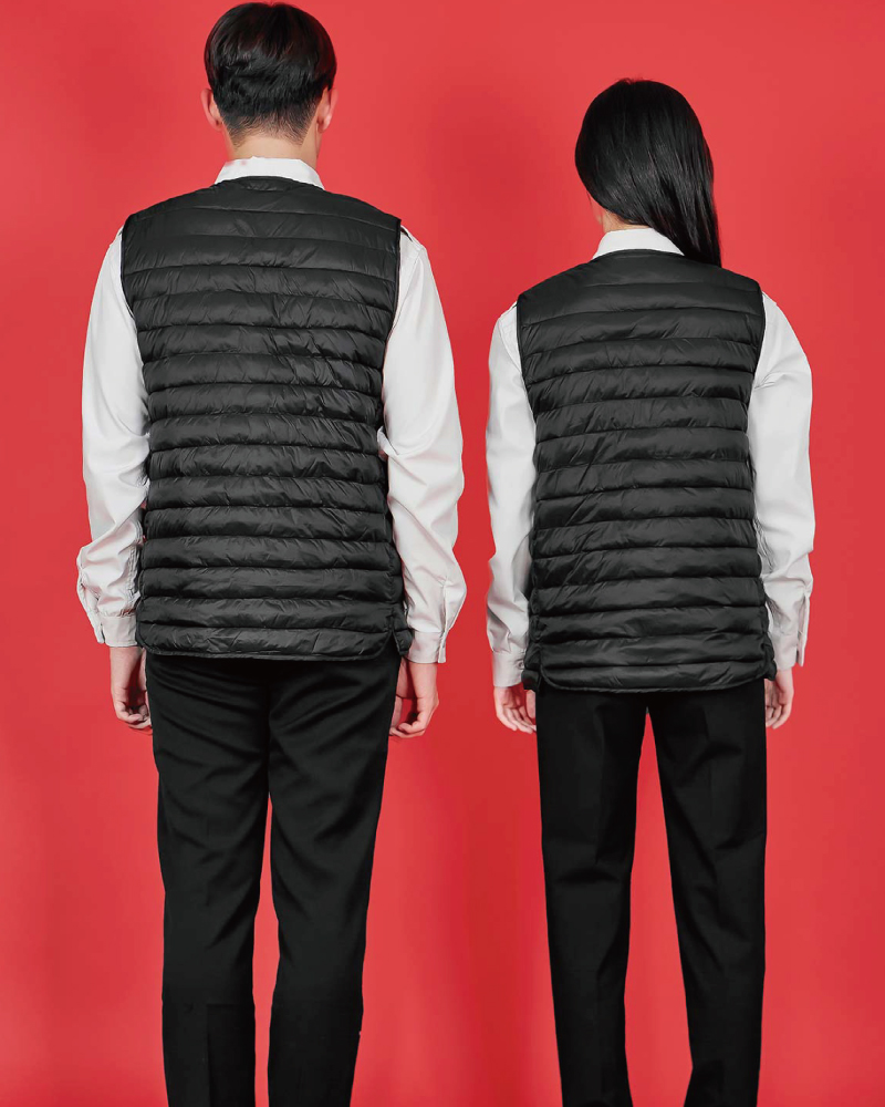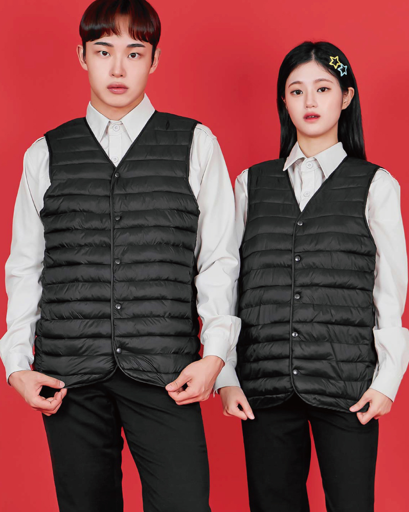회사 사무실에서, 간주기 추위가 염려될때 가볍게 입을수 있는 경량 패딩조끼, 에어볼 충전으로 가볍고 따뜻합니다.