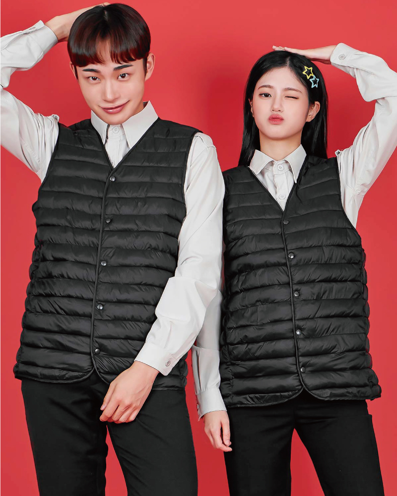 회사 사무실에서, 간주기 추위가 염려될때 가볍게 입을수 있는 경량 패딩조끼, 에어볼 충전으로 가볍고 따뜻합니다.