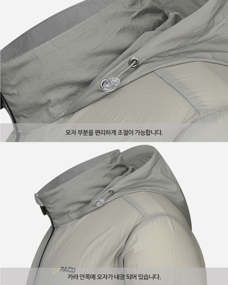 가볍고 고급스러운 나일론 소재의 경량 바람막이 자켓으로, 카라 안쪽에 모자가 내장된 스타일로 스포츠 활동과 일상 데일리룩으로도 손색이 없는 제품
