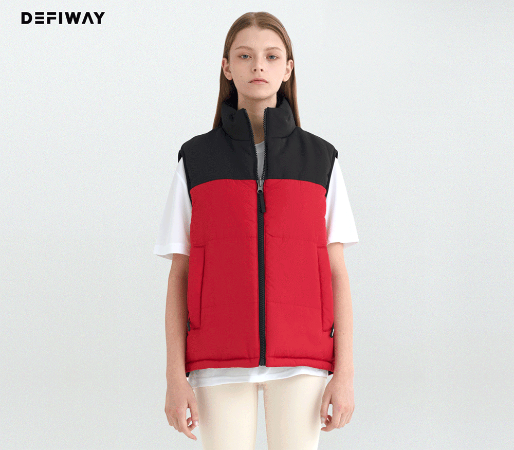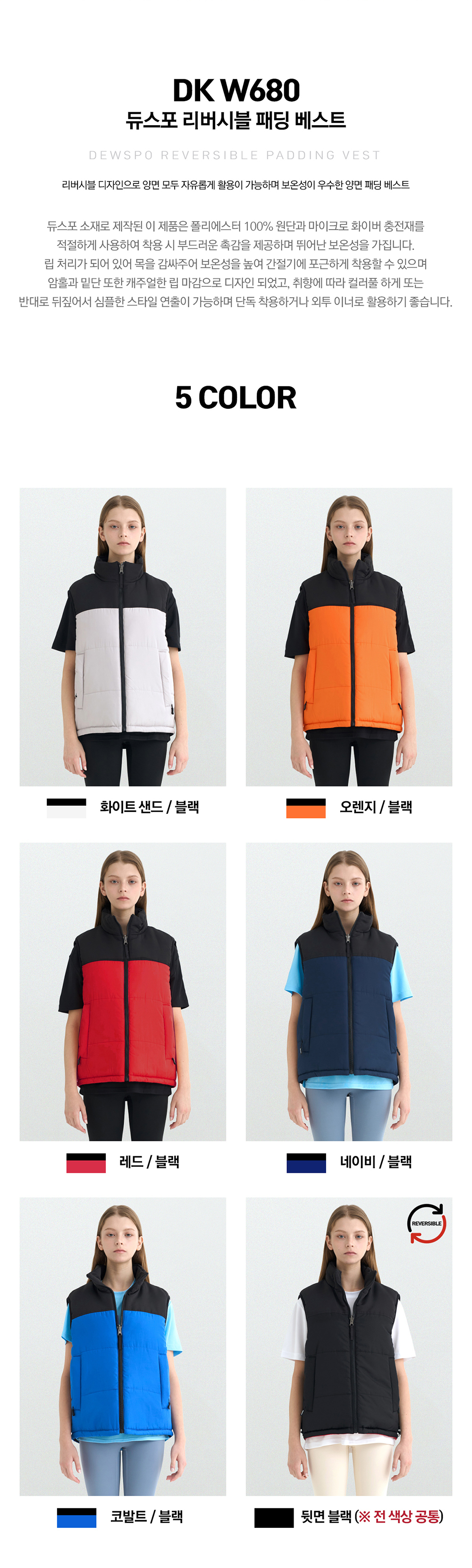 패딩조끼 하나로 두가지 컨셉을 연출 할수 있는 리버시블 스타일의 듀스포 소재의 패딩 조끼로 축구 배구 농구 등 팀스포츠 활동에 적합한 기능적인 디자인